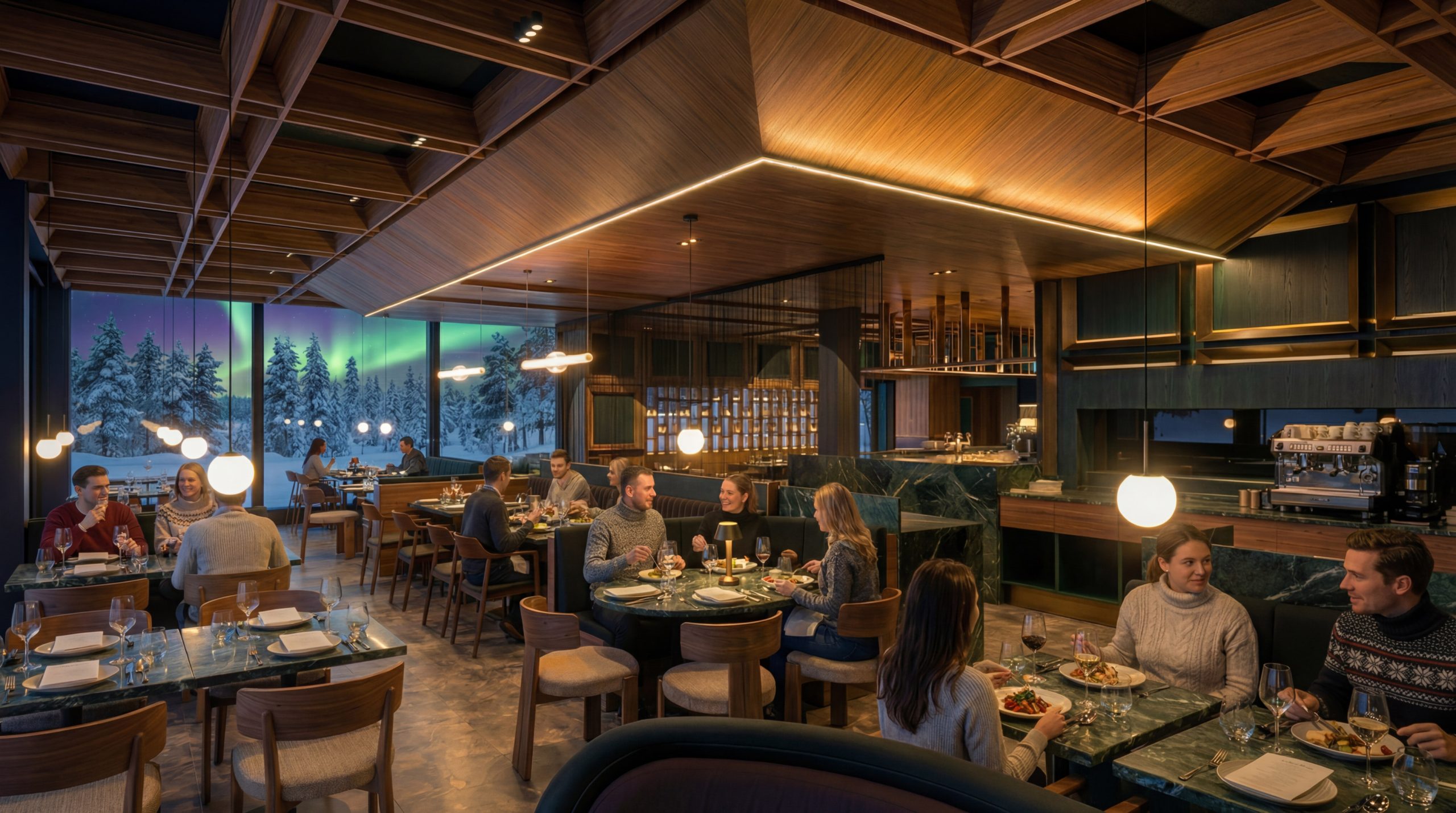 The restaurant is designed as a destination in itself – offering a refined culinary experience that combines Arctic ingredients, international influence, and a unique atmosphere.